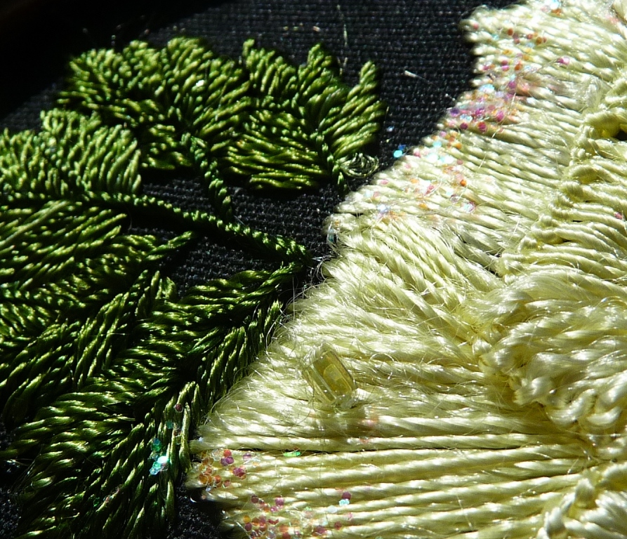 To avoid the dark background fabric from peeking through, and because Z-twist floss (or most other fibers) tend to twist (rayon can get tighter and tighter until it looks like string), I discovered that if I "unwind" the Cire before finishing the stitch (or even lifting it off the fabric a bit and then settling it back in place), I have a smoother satin stitch. Of course, laying threads is also important when using satin stitch.